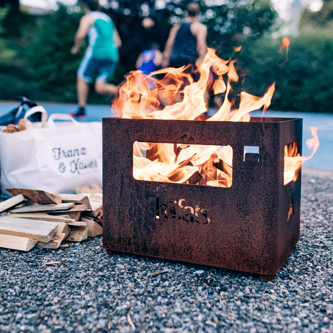 Beer Box is well built from top to bottom. The sturdy fire basket is made from a 2 mm thick sheet of corten steel. The solid material - used in building construction - develops a vivid, stable layer of rust which regularly regenerates itself. It forms a unique patina that protects the material against progressive corrosion. Beer Box is long-lasting and 100% recyclable.