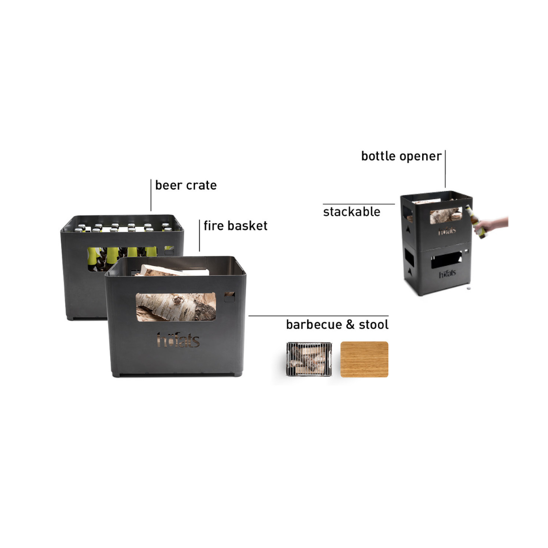 A fire basket in the shape of a beer crate. But also a barbecue, a wooden box, a stool. The perfect party tool for spontaneous outings and outdoor events. Bottle opener included!
